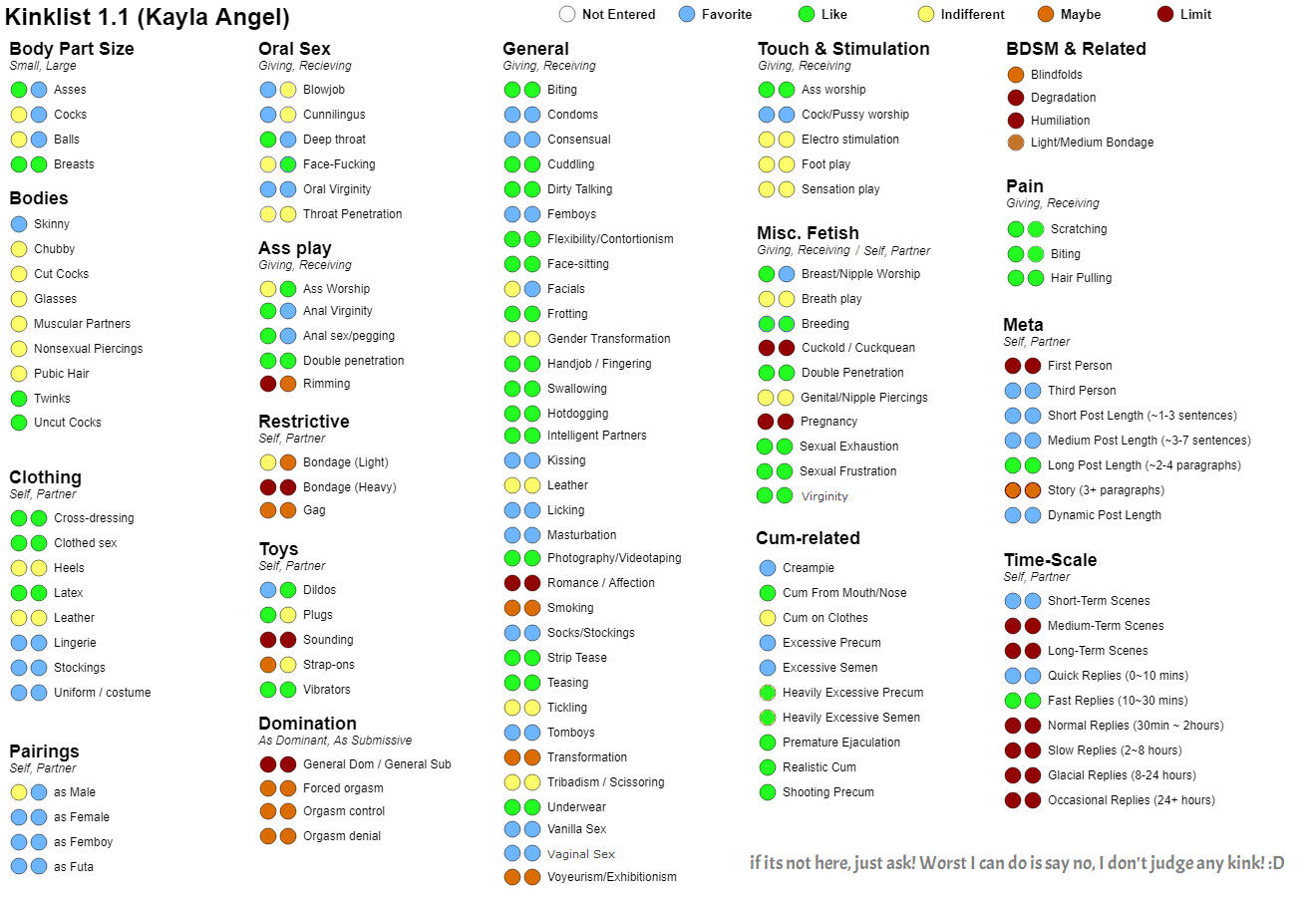 I have a preference for one-off RPs with continuity between them, rather than extended scenes that take place over the course of multiple sessions. I typically do casual, slice-of-life scenes without any lasting consequences or commitments.Chances are, you've met Kayla at a venue and that will probably be the basis for the RP, but I'm also up for other things, and we can plan out a way in which our characters meet, or know each other outside of where we met in-game. I'm very open to ideas!I enjoy scenes that are NSFW in nature, though not necessarily starting as such. Of course, this isn't necessary, and I'm happy to chat and be friends with your character. Please let me know upfront if you have a specific intention or preference! Communication is key!For the purposes of RP, Kayla is aromantic. She's pansexual, but she will rebuff any romantic advances.If you're new to RP, or just nervous, don't be afraid to ask me questions. I'm pretty experienced, and I'll help you figure out how to do stuff, free of charge, NSFW or otherwise. Don't be shy, I don't judge and I won't make it awkward for you!If you want me to keep something private, or have an interaction be non-canonical, do let me know, and I'll work with you!I will not mix IC and OOC feelings. I am not my character.